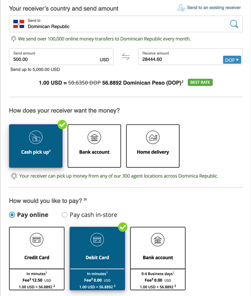 Another nice thing about Western Union is their exchange rates are so low. It’s always hovering around 100%. At the time of writing this article, it is higher than what is reported on Google (56.8892 vs 56.72), although only by 0.002%. I don’t know how they pay for staff.nnThe last great thing is they are everywhere. They are in every small town and there are dozens in large cities. Their locations aren’t always accurate in small towns, so be sure to ask around before hiking out in the Caribbean sun.nnIf you haven’t used Wester Union before, you can use my referral code. We’ll both get a $20 Amazon gift card if you send $100 within $30 days.